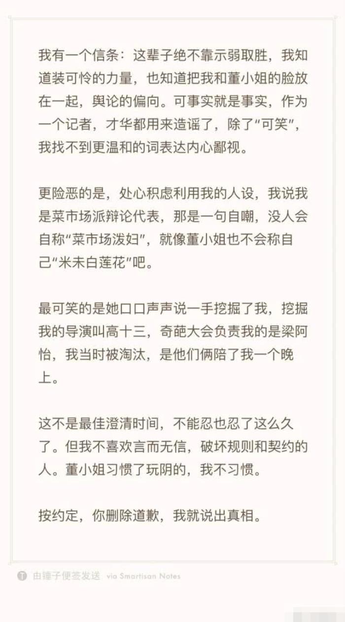 傅首尔说:按照约定,你删除道歉,我说出真相!看来两人之间为了平息之前网上闹得沸沸扬扬的“化妆间施暴”事件达成了协议,不管纠葛如何,之前董婧第一时间在网络上发表个人看法的声明直指傅首尔对她施暴造成了网友们对傅首尔以及其家长的网暴事件,傅首尔曾表示自己和家人不堪其扰,但是对于没做过的事情不会承认,问心无愧,随后董婧表示这就是两人之间的摩擦,是自己不懂事,向傅首尔道歉才停息。