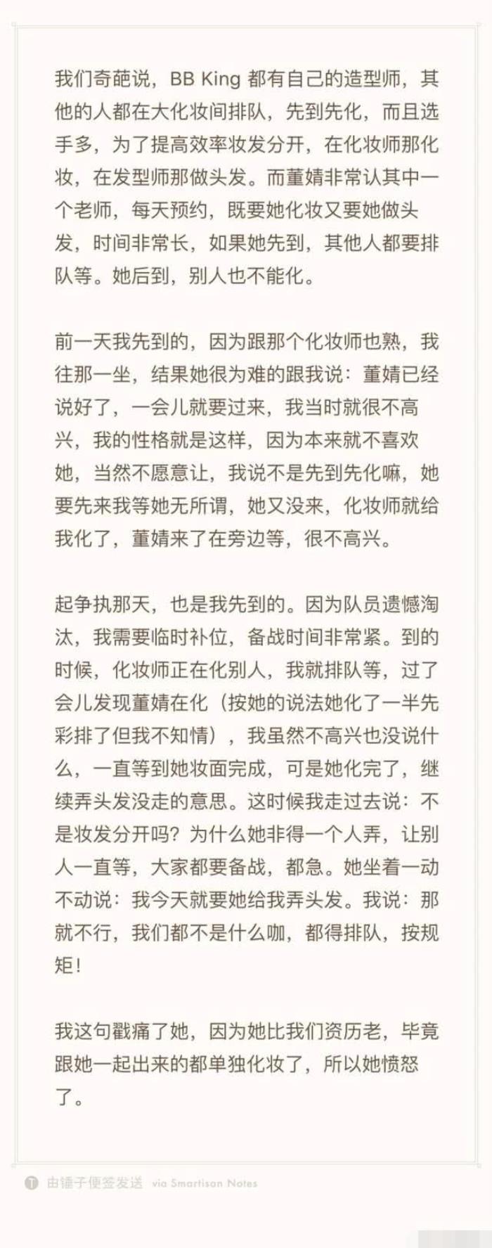 她说,自己被董婧的温柔表象迷惑,以为她是一个善良单纯的人,听闻马薇薇等人抱团欺负她的时候,别人非议董婧的时候,自己都第一个冲上去站在她身后,为她鼓气。两人的争执起源于化妆间,所有人都是要排队化妆和做头发两步骤的,为了效率,化妆和做头发分开,但董婧例外,每次指定人做头发化妆。