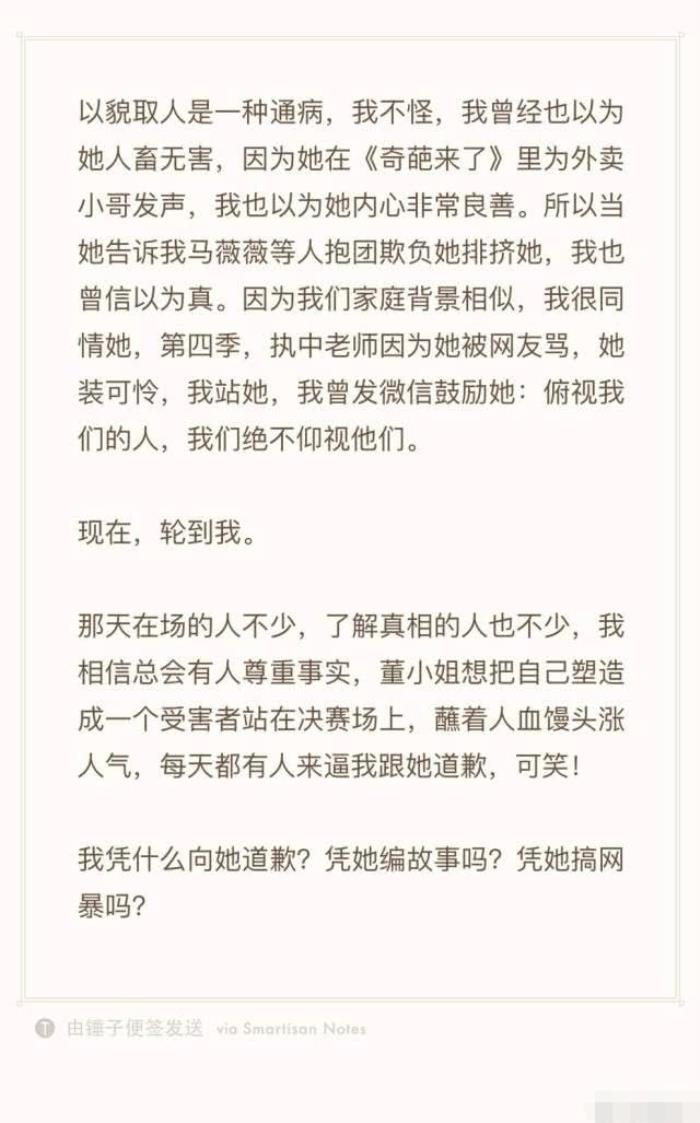 从傅首尔的描述中可以看到董婧骂人的话十分难听,傅首尔还表示自己并不是董婧挖掘的,而是另一个人,自己被淘汰的时候也是其他人陪伴自己,董婧并未做些什么!所以自己也不是所谓的忘恩负义,不仗义!以前不懂为什么别人排挤她,今天算是明白了,颠倒是非黑白,网络施暴,现实施暴。