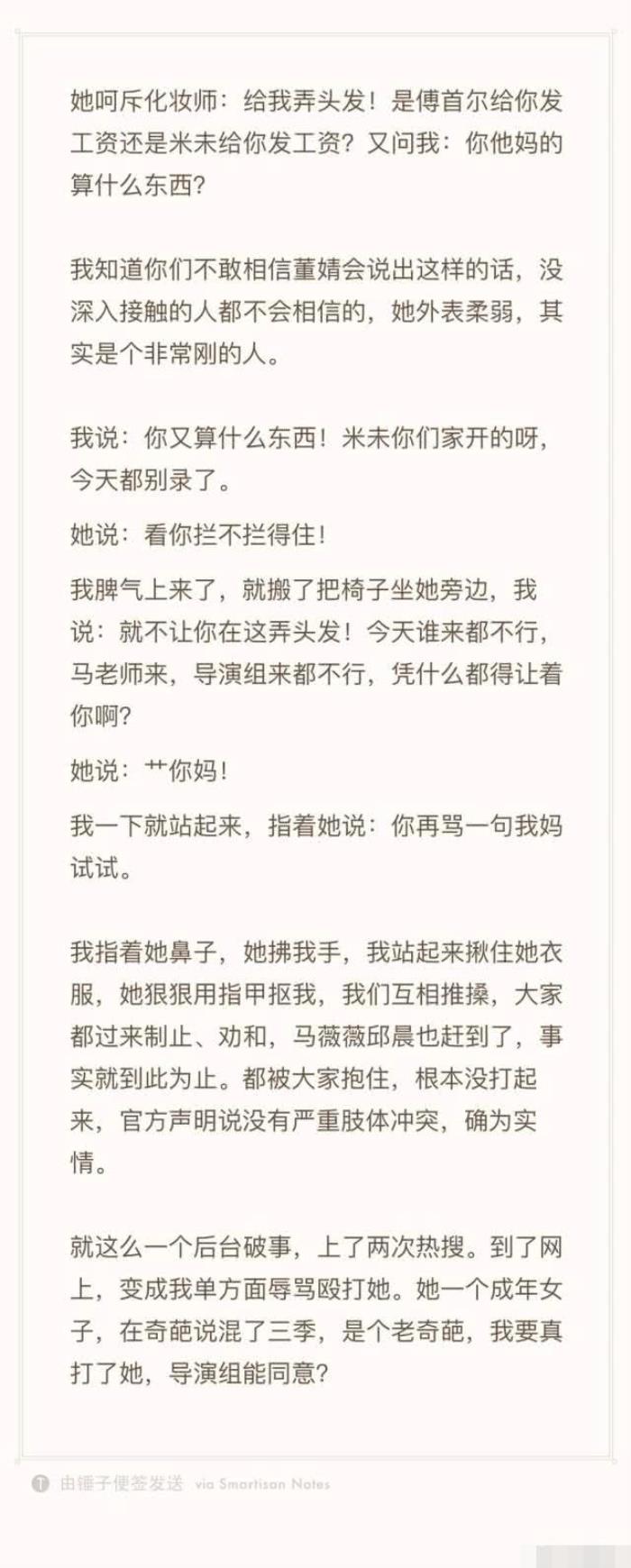 先来先做在董婧这里成为虚无,但傅首尔坚持原则,原则就是排队先到先做,后来有一次董婧在化妆,化完妆之后还不走,非要化妆的人也做头发,傅首尔表示自己很着急,马上就要录节目了,但是董婧就是要这个人给自己做头发,于是两人争执起来。